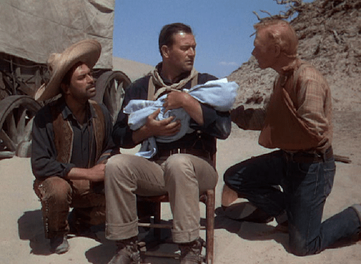 When we first meet the woman, alone and abandoned by her husband, we realize she’s remarkably clearheaded about the future, for both her child and herself. Because one of the outlaws helps deliver her son, she enlists the three of them to be his godfathers. Given the circumstances, who could refuse? Certainly not these men, and they agree to care for the infant.