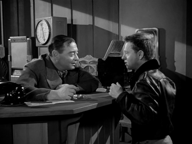 Rooney plays a car mechanic whose boss (Art Smith) is a mean, cheap jerk. We are given a glimpse into both men’s characters early in the film: the boss gets angry about employees leaving the light on in the stockroom and, in a fit of pique, turns off the light above Rooney’s head as he works. As soon as the boss leaves, Rooney glares after him and snaps the light back on.