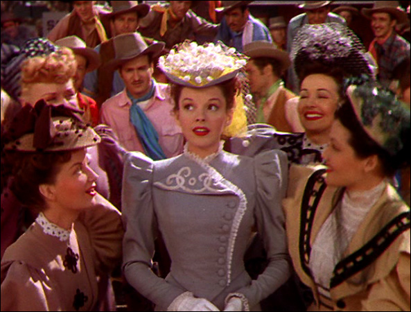 Garland is utterly charming. In an early scene, she sits on the westbound train, glancing enviously at the fried chicken the Harvey girls are eating, while she pokes at a single leftover crust in her lunch basket. Nevertheless, she spreads her napkin with a flourish over her lap and peers into her basket as though she can’t decide which imaginary delicacy to eat first.