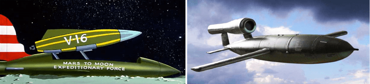 V-16 Rocket vs. the German V-1 flying bomb. Image of V-1: Fiddlers Green
