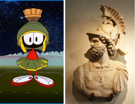 On the moon, Bugs meets a tiny Martian who resembles Mars, the Roman war diety. (See below.) The Martian wears a helmet crowned by the business end of a push broom.