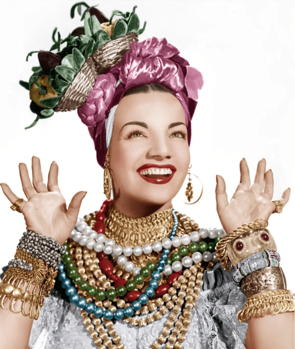 The Guardian explains how Miranda “customized” the look of the women of Bahia, the style of Afro-Brazilian street vendors (“baianas”) in colonial times. “These [women] wore lace tops, gold jewellery and simple cloth turbans, and carried trays of fruit and other produce on their heads. In her stylised version, Carmen added sequins and a small imitation basket of fruit to her turban, which was made of lamé fabric.”³